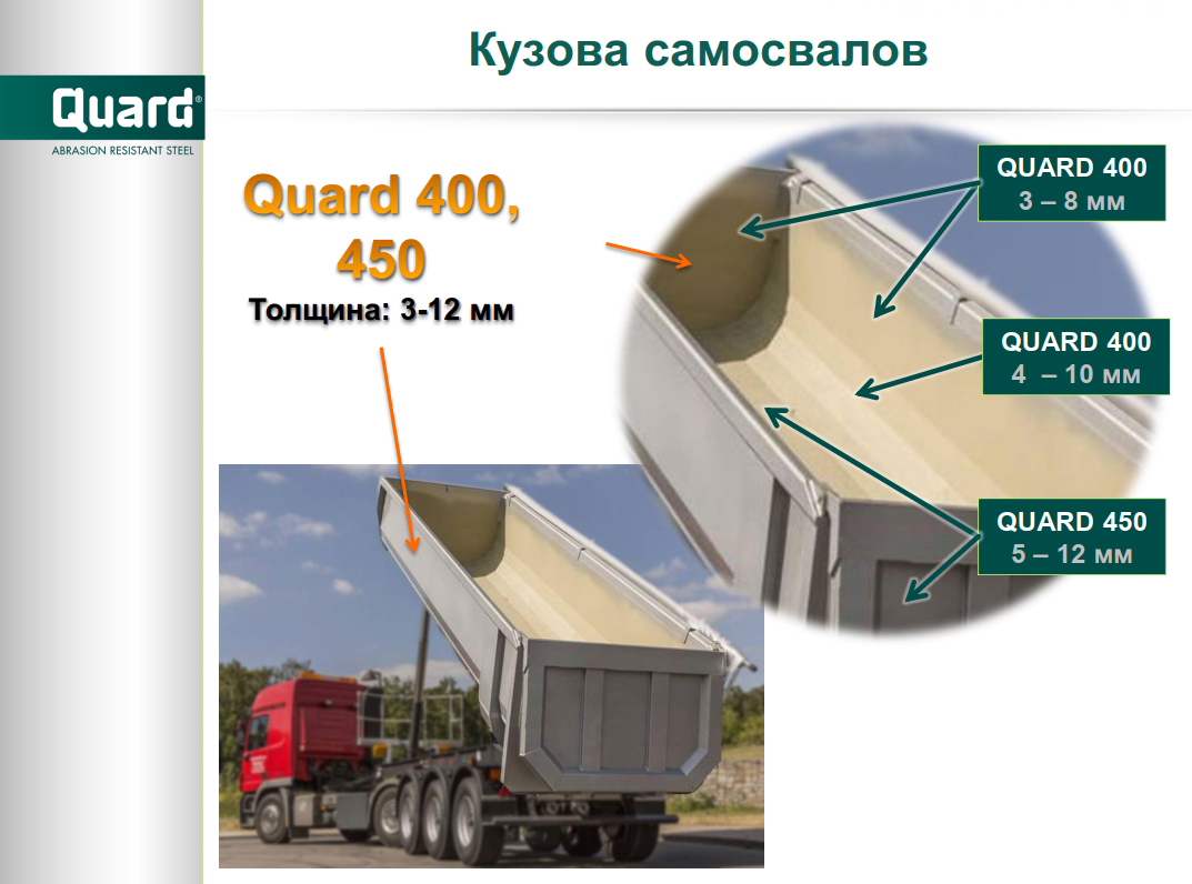 Кузов, виготовлений зі сталі Quard, важить менше і служить довше в порівнянні з моделями зі сталі м'якіших марок. Завдяки унікальному поєднанню твердості та ударної в'язкості самоскильні кузови зі сталі Quard відрізняються стійкістю до зносу від тертя ковзання та ударного навантаження. За рахунок застосування сталі Quard можна використовувати меншу кількість зовнішніх елементів жорсткості. Типові змінні зносостійкі компоненти – це самофутерування та частини задньої секції кузова.